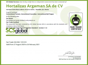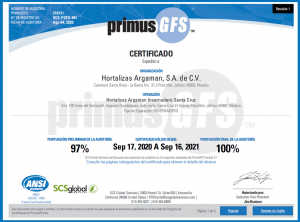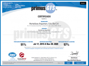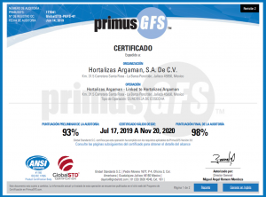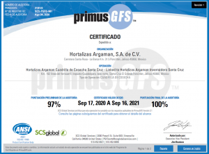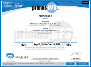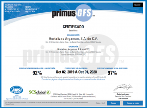 Actualmente nuestro Sistema de Seguridad Alimentaria está avalado por PrimusGSF 3.1 también contamos con la certificación en responsabilidad Social otorgada por Fair Trade; ambas certificaciones son auditadas anualmente para contar con la vigencia.